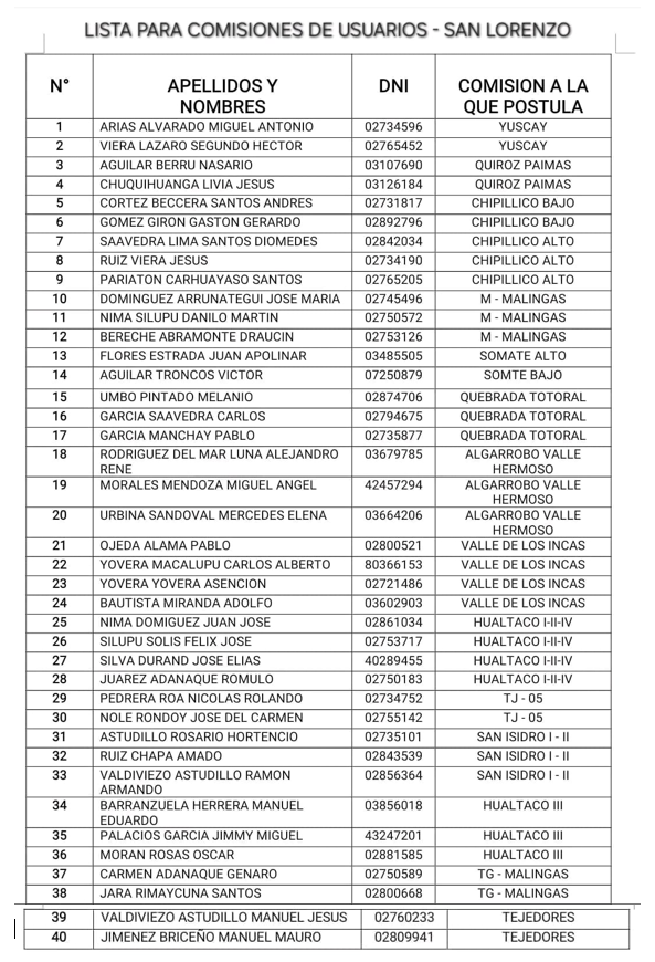 LISTA DE CANDIDATOS A LAS COMISIONES DE USUARIOS Y JUNTA DE USUARIOS SAN LORENZO